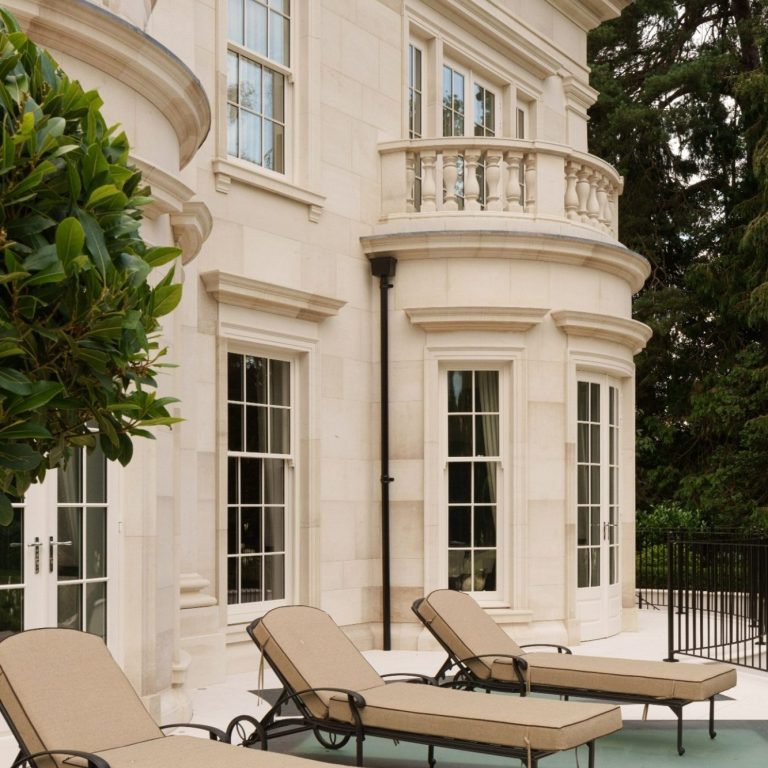 Cotswold stone stair linings and entance hall floor with contrasting cabouchons