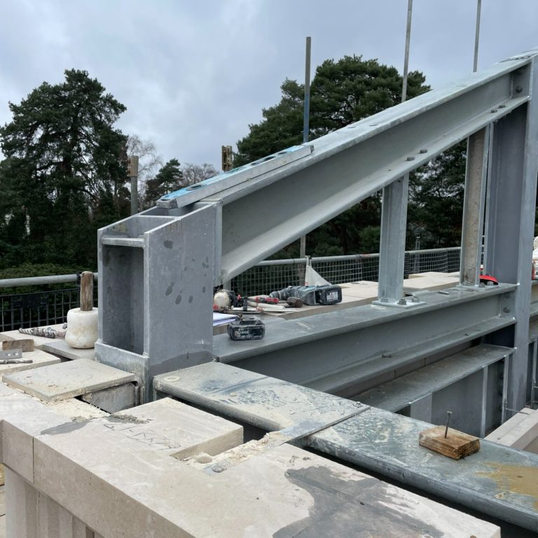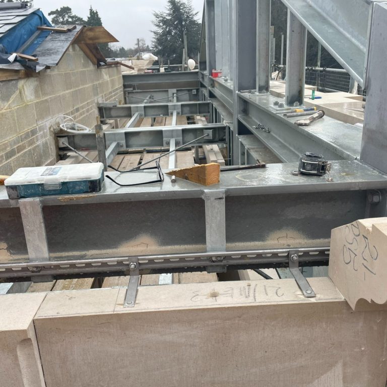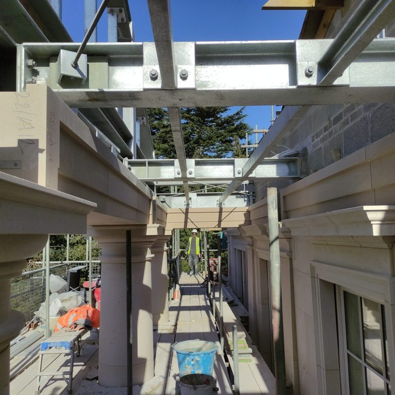 Pediment tympanum under construction, showing mild steel 'A' frame